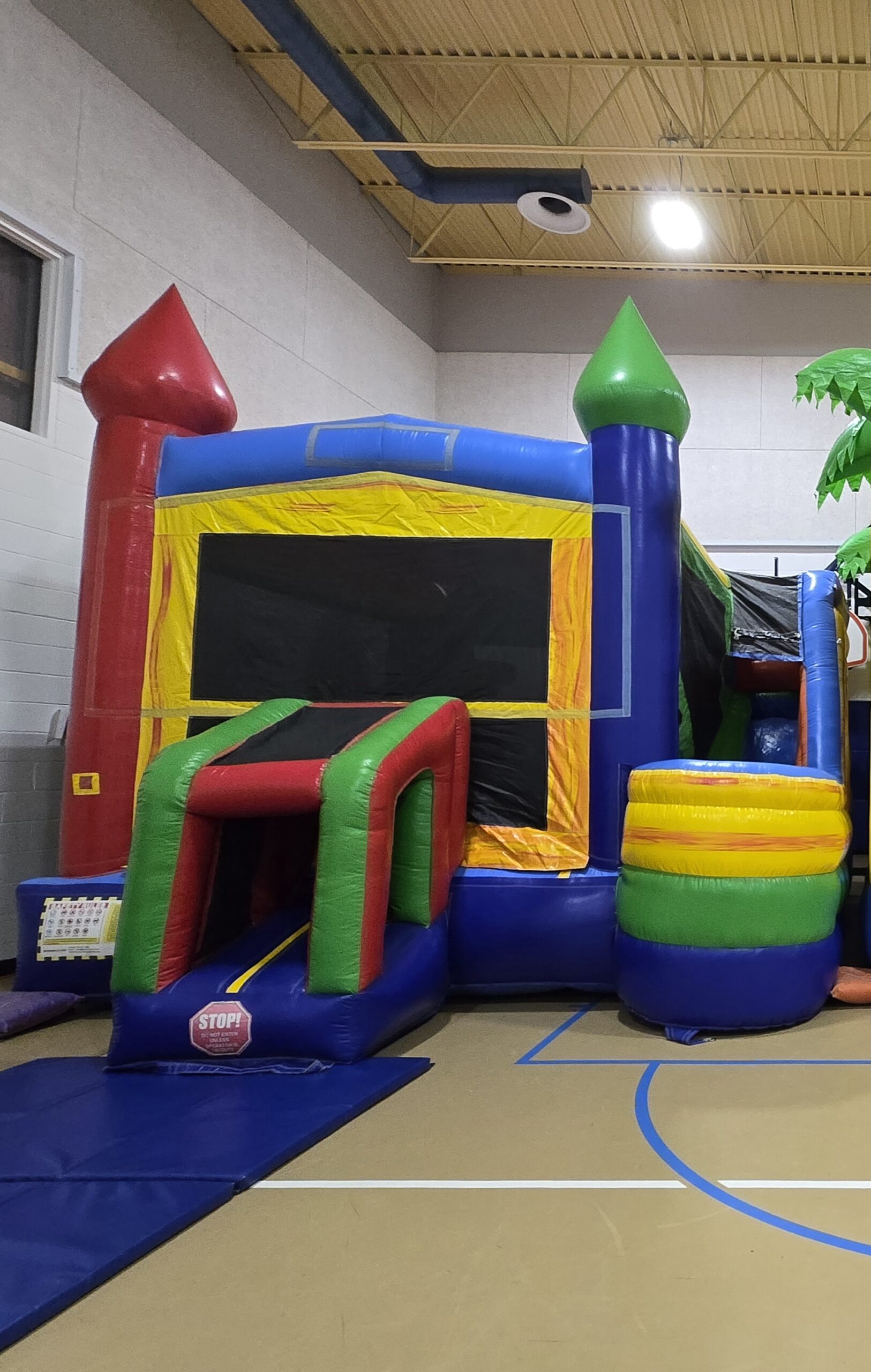 An enclosed bounce house with a bouncing area and a slide on the side